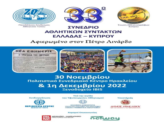 Το Διοικητικό Συμβούλιο του Πανελληνίου Συνδέσμου Αθλητικού Τύπου (ΠΣΑΤ) με την υποστήριξη της Περιφέρειας Κρήτης, διοργανώνει το 33ο Συνέδριο των αθλητικών συντακτών Ελλάδας και Κύπρου που θα πραγματοποιηθεί στις 30 Νοεμβρίου και 1 Δεκεμβρίου 2022. Το συνέδριο τελεί υπό την αιγίδα του Υφυπουργείου Αθλητισμού και τη στήριξη του Δήμου Ηρακλείου.
