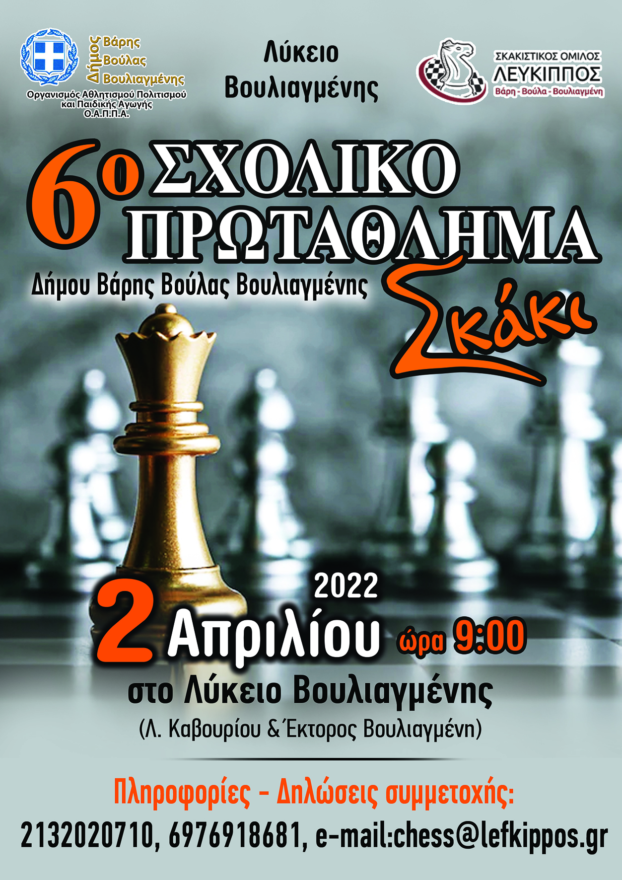 Ο Δήμος Βάρης Βούλας Βουλιαγμένης και ο Οργανισμός Αθλητισμού Πολιτισμού και Παιδικής Αγωγής (Ο.Α.Π.Π.Α.) σας προσκαλούν στο Σχολικό Πρωτάθλημα Σκάκι, το Σάββατο 2 Απριλίου, στις 9.00 π.μ. στο Λύκειο της Βουλιαγμένης, που διοργανώνεται σε συνεργασία με τον Σκακιστικό Όμιλο του Δήμου μας, «Λεύκιππο».