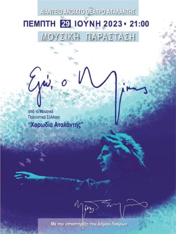 Αφιέρωμα στον Μίκη Θεοδωράκη με τίτλο “Εγώ, ο Μίκης” από τον Μουσικό και Πολιτιστικό Σύλλογο “Χορωδία” Αταλάντης σε συνδιοργάνωση με το Δήμο Λοκρών