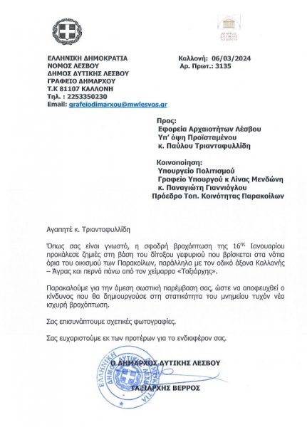 Με επιστολή του – που δημοσιοποίησε ο Δήμος Δυτικής Λέσβου – στην Εφορεία Αρχαιοτήτων Λέσβου και στον προϊστάμενο της κ. Παύλο Τριανταφυλλίδη ο Δήμαρχος Ταξιάρχης Βέρρος ζητά την άμεση σωστική παρέμβαση της υπηρεσίας στην αποκατάσταση μνημείου αρμοδιότητάς της και συγκεκριμένα του δίτοξου γεφυριού που βρίσκεται στα νότια όρια του οικισμού των Παρακοίλων, παράλληλα με τον οδικό άξονα Καλλονής – Άγρας και περνά πάνω από τον χείμαρρο «Ταξιάρχης».