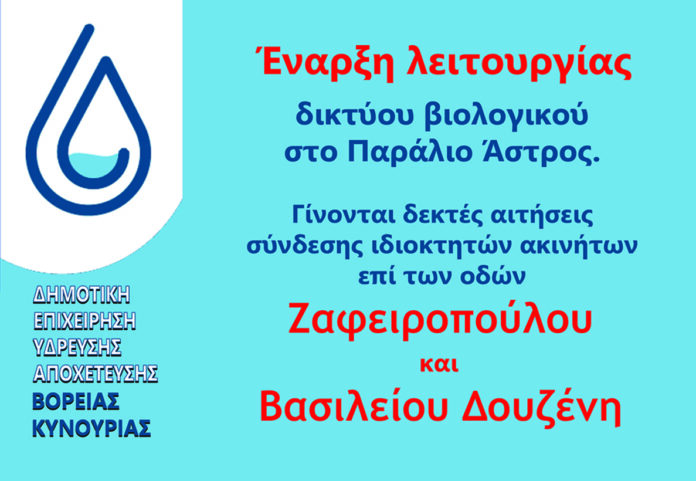 Η ΔΕΥΑ Βόρειας Κυνουρίας ενημερώνει ότι, μετά και την ολοκλήρωση της αντικατάστασης του καταθλιπτικού αγωγού ακαθάρτων στο Παράλιο Άστρος, είναι εφικτή η έναρξη λειτουργίας του δικτυού βιολογικού καθαρισμού στο Παράλιο Άστρος. Οι συνδέσεις των ακινήτων με το δίκτυο θα γίνουν σταδιακά και εφόσον προηγουμένως έχουν ολοκληρωθεί οι διοικητικές διαδικασίες για την έγκριση της σύνδεσης αποχέτευσης.
