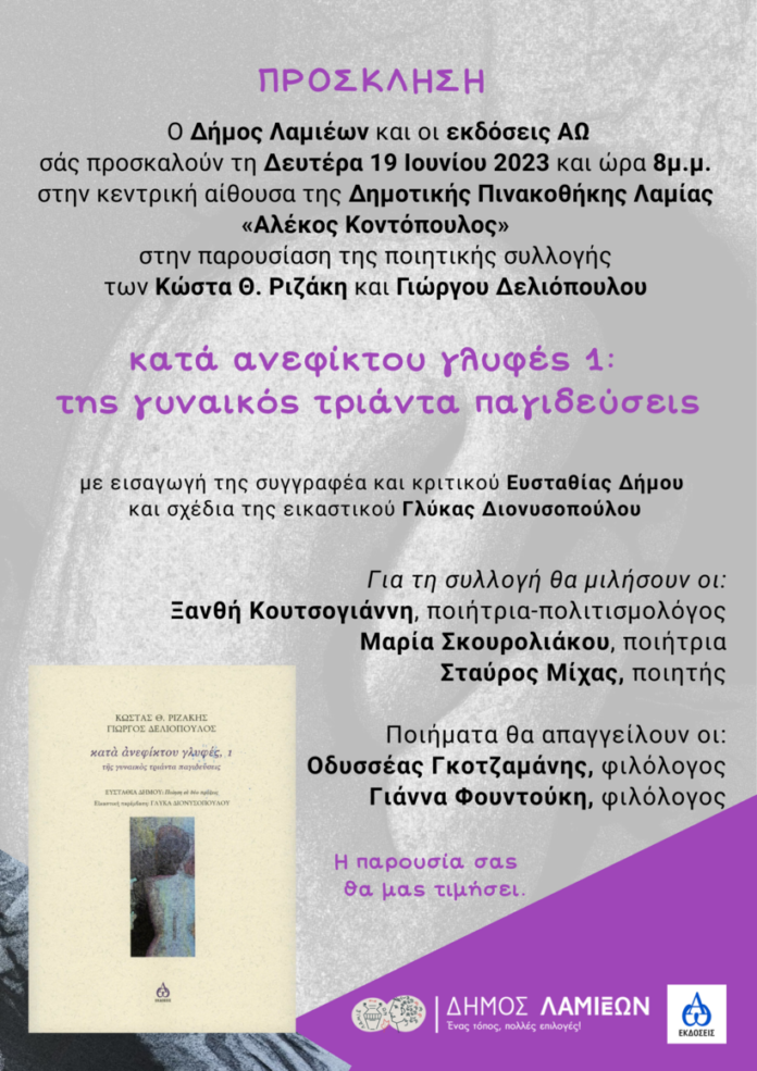 Ο Δήμος Λαμιέων και οι εκδόσεις ΑΩ σας προσκαλούν τη Δευτέρα 19 Ιουνίου 2023 και ώρα 8 μ.μ. στην κεντρική αίθουσα της Δημοτικής Πινακοθήκης Λαμίας «Αλέκος Κοντόπουλος» στην παρουσίαση της ποιητικής συλλογής των Κώστα Θ. Ριζάκη και Γιώργου Δελιόπουλου, με τίτλο: «κατά ανεφίκτου γλυφές 1: της γυναικός τριάντα παγιδεύσεις» με εισαγωγή της συγγραφέα και κριτικού Ευσταθίας Δήμου και σχέδια της εικαστικού Γλύκας Διονυσοπούλου.