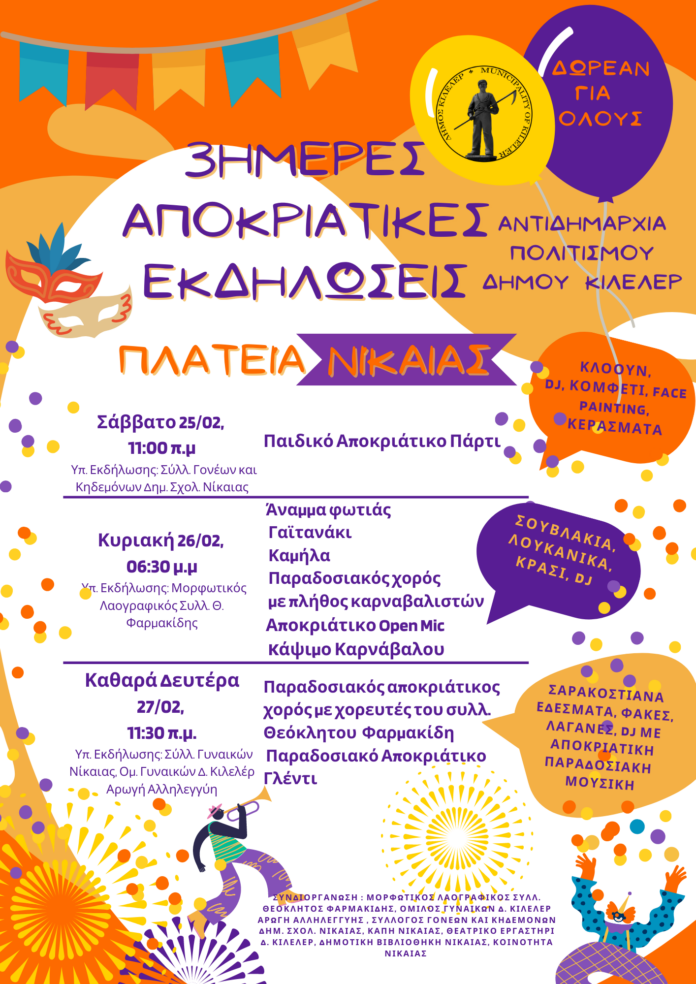 Σε αποκριάτικους ρυθμούς κινείται αυτές τις μέρες ο Δήμος Κιλελέρ.Τριήμερες αποκριάτικες εκδηλώσεις διοργανώνονται στην πλατεία της Νίκαιας υπό την αιγίδα της Αντιδημαρχίας Πολιτισμού του Δήμου Κιλελέρ με συνδιοργανωτές το Μορφωτικό Λαογραφικό Σύλλογο «Θεόκλητος Φαρμακίδης», τον Όμιλο Γυναικών Δήμου Κιλελέρ «Αρωγή Αλληλεγγύη», τον Σύλλογο Γονέων και Κηδεμόνων Δημοτικού Σχολείου Νίκαιας, το ΚΑΠΗ Νίκαιας, το Θεατρικό Εργαστήρι Δήμου Κιλελέρ,τη Δημοτική Βιβλιοθήκη Νίκαιας και την Τοπική Κοινότητα Νίκαιας.