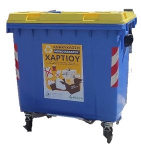 Συνολικά 152 εξωτερικούς μπλε κάδους με κίτρινο καπάκι, για τη χωριστή συλλογή του χαρτιού, χωρητικότητας 1.100lt τοποθέτησε ο Δήμος Χανίων τόσο πλησίον των κτιρίων της αρμοδιότητάς του, όσο & σε λοιπές Δημόσιες Υπηρεσίες, δομές υγείας, φορείς εκπαίδευσης, κοινωνικές δομές και πολιτιστικές υποδομές, καθώς και σε σχολικές μονάδες.