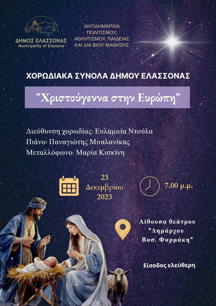 Η Αντιδημαρχία Πολιτισμού, Αθλητισμού, Παιδείας και Δια Βίου Μάθησης του Δήμου Ελασσόνας σας προσκαλεί στη χριστουγεννιάτικη συναυλία «Χριστούγεννα στην Ευρώπη» με τα Χορωδιακά Σύνολα του Δήμου Ελασσόνας, το Σάββατο 23 Δεκεμβρίου, ώρα 7:00 μ.μ., στην αίθουσα θεάτρου «Δημάρχου Βασ. Φαρμάκη», στην Ελασσόνα.