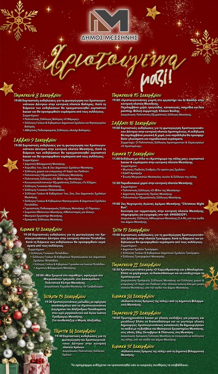 Οι εορταστικές εκδηλώσεις του Δήμου Μεσσήνης ξεκινούν την Παρασκευή 8 Δεκεμβρίου στις 7 μ.μ. με τη φωταγώγηση του χριστουγεννιάτικου δέντρου στην κεντρική πλατεία Βαλύρας.