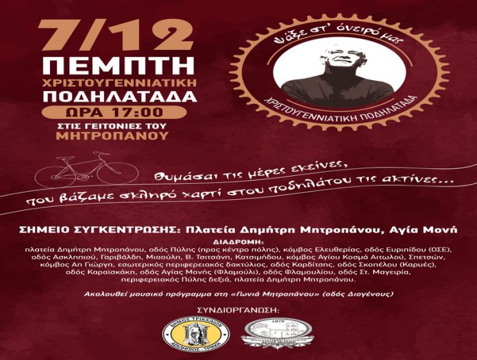 Ο Δήμος Τρικκαίων και ο Μορφωτικός Σύλλογος Αγίας Μονής διοργανώνουν στις 17:00 το απόγευμα της Πέμπτης 7 Δεκεμβρίου 2023, μια Χριστουγεννιάτικη ποδηλατάδα «Στις γειτονιές του Μητροπάνου».