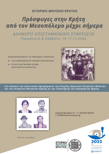 Μέρος των αποτελεσμάτων του προγράμματος «Πρόσφυγες στην Κρήτη από τον Μεσοπόλεμο μέχρι σήμερα» θα παρουσιαστούν στο διήμερο Συμπόσιο που οργανώνει η ΕΚΙΜ στο Αμφιθέατρο Γιάννη Περτσελάκη του Ιστορικού Μουσείου Κρήτης στις 16 και 17 Δεκεμβρίου 2022, με τη συμμετοχή μελών της επιστημονικής ομάδας του προγράμματος και προσκεκλημένων ερευνητών που έχουν ασχοληθεί με το ζήτημα της παρουσίας των προσφύγων στη Κρήτη.