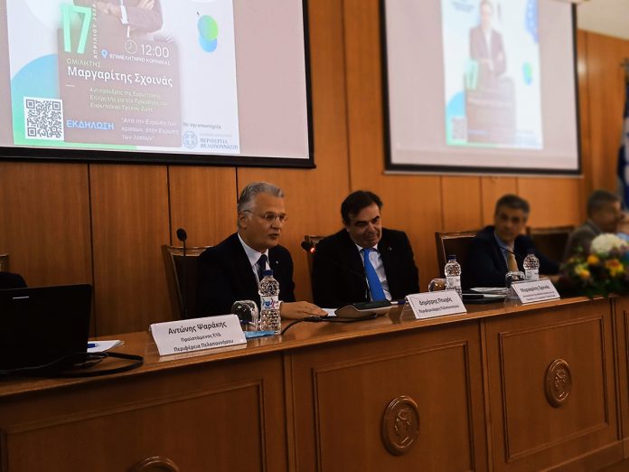 Στην κατάμεστη αίθουσα εκδηλώσεων, παρουσία, ως κεντρικού ομιλητή, του Αντιπροέδρου της Ευρωπαϊκής Επιτροπής για την Προώθηση του Ευρωπαϊκού Τρόπου Ζωής Μαργαρίτη Σχοινά, ο Περιφερειάρχης αναφέρθηκε στο ρόλο της Πελοποννήσου στη σημερινή πορεία της Ελλάδας μέσα στην Ευρώπη και τις νέες προκλήσεις που αναδύονται. «Στη νέα δυναμική πορεία της χώρας μας, μέσα σε μια Ευρώπη που αίρεται στο ύψος των περιστάσεων, εμείς εδώ έχουμε οραματιστεί τον τόπο μας, την Πελοπόννησο, σε ρόλο σημαιοφόρου. Μπροστάρη», είπε χαρακτηριστικά και συνέχισε αναφέροντας: