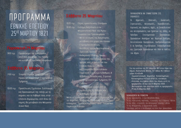 Δήμος Ανατολικής Ανατολικής Μάνης: Πρόγραμμα εορτασμού Εθνικής Επετείου 25ης Μαρτίου 1821 στο Γύθειο