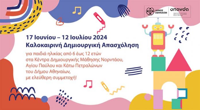 Τα Κέντρα Δημιουργικής Μάθησης Νορντάου και Αγίου Παύλου, καθώς και για πρώτη φορά το Κέντρο Δημιουργικής Κάτω Πετραλώνων υποδέχονται τα παιδιά ηλικίας από 6 έως 12 ετών (που έχουν γεννηθεί από το 2012 έως το 2017), από 17 Ιουνίου έως 12 Ιουλίου 2024, για να αξιοποιήσουν εποικοδομητικά τον ελεύθερό τους χρόνο αλλά και να διασκεδάσουν στο πρόγραμμα Δημιουργικής Απασχόλησης που προσφέρει δωρεάν και αυτό το καλοκαίρι ο Δήμος Αθηναίων.