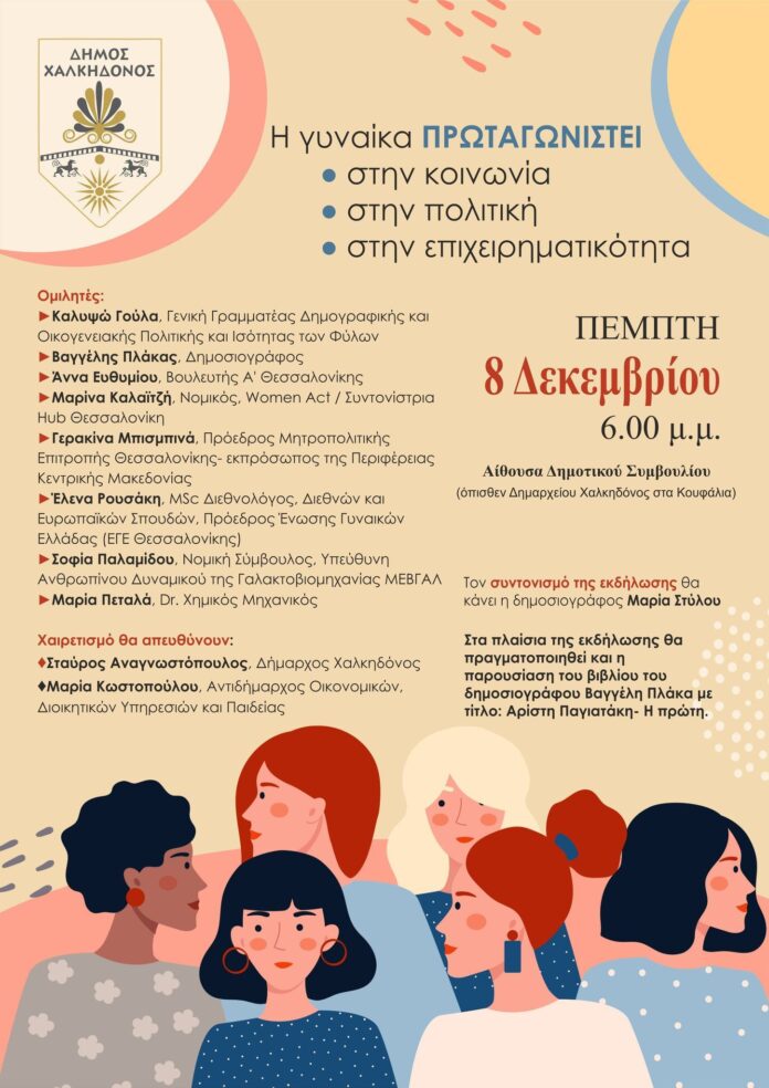 Η γυναίκα πρωταγωνιστεί στην κοινωνία, την πολιτική και την επιχειρηματικότητα είναι το θέμα της εκδήλωσης που διοργανώνει ο Δήμος Χαλκηδόνος την ερχόμενη Πέμπτη 8 Δεκεμβρίου 2022 στις 6 το απόγευμα στην αίθουσα του Δημοτικού Συμβουλίου Χαλκηδόνος, στα Κουφάλια.