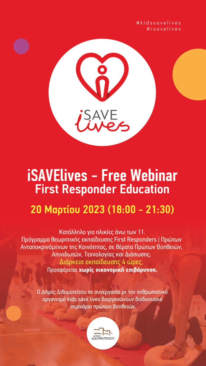 Ο Δήμος Διδυμοτείχου σε συνεργασία με τον ανθρωπιστικό οργανισμό ‘’KIDS SAVE LIVES’’ διοργανώνουν επιμορφωτικό διαδικτυακό σεμινάριο Πρώτων Βοηθειών. Το παραπάνω διαδικτυακό σεμινάριο είναι κατάλληλο για όλες και όλους ηλικίας άνω των 11 ετών.