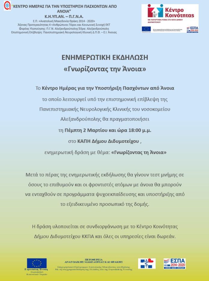 Το Κέντρο Ημέρας για την Υποστήριξη Πασχόντων από Άνοια το οποίο λειτουργεί υπό την επιστημονική επίβλεψη της Πανεπιστημιακής Νευρολογικής Κλινικής του νοσοκομείου Αλεξανδρούπολης και το Κέντρο Κοινότητας του ΚΚΠΑ του Δήμου Διδυμοτείχου πραγματοποιούν την Πέμπτη 2 Μαρτίου κι ώρα 18:00 στο ΚΑΠΗ Δήμου Διδυμοτείχου , ενημερωτική δράση με θέμα : «Γνωρίζοντας την Άνοια».