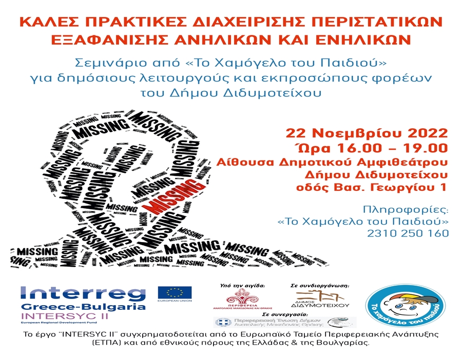 «Το Χαμόγελο του Παιδιού», στο πλαίσιο υλοποίησης του έργου «Ολοκληρωμένες Χωρικές Συνέργειες για την Υγεία και την Προστασία των Παιδιών II (Integrated Territorial Synergies for Children Health and Protection ΙΙ) – INTERSYC II», πραγματοποιεί, Σεμινάριο Ενημέρωσης για δημόσιους λειτουργούς και εκπρόσωπους φορέων (Αστυνομία, Κοινωνικές Υπηρεσίες, Σχολικές μονάδες κλπ) για τις «Καλές πρακτικές διαχείρισης περιστατικών εξαφάνισης ανηλίκων και ενηλίκων», τη λειτουργία της Ευρωπαϊκής Γραμμής για τα Εξαφανισμένα Παιδιά 116000 και της Εθνικής Γραμμής για τους Αγνοούμενους Ενήλικες 1017, τις οποίες λειτουργεί «Το Χαμόγελο του Παιδιού» 24/7, 365 ημέρες με εξειδικευμένους ψυχολόγους. Το σεμινάριο θα πραγματοποιηθεί την Τρίτη 22 Νοεμβρίου 2022 και ώρες 16.00 μ.μ. – 19:00 μ.μ. στην Αίθουσα Δημοτικού Αμφιθεάτρου του Δήμου Διδυμοτείχου (Βασ. Γεωργίου 1) σε συνδιοργάνωση με το Δήμο Διδυμοτείχου, σε συνεργασία με την Περιφερειακή Ένωση Δήμων Ανατολικής Μακεδονίας και Θράκης και υπό την αιγίδα της Περιφέρειας Ανατολικής Μακεδονίας και Θράκης.