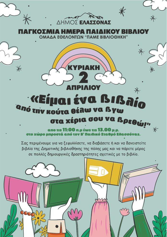 Την Κυριακή 2 Απριλίου «Παγκόσμια ημέρα παιδικού βιβλίου» ο Δήμος Ελασσόνας και η Ομάδα Εθελοντών «Πάμε Βιβλιοθήκη» σας προσκαλούν από τις 11:00 έως τις 13:00 στο χώρο μπροστά από τον Β΄ Παιδικό Σταθμό Ελασσόνας, στην πλατεία Εθνικής Αντιστάσεως, για να ξεφυλλίσετε, να διαβάσετε ή και να δανειστείτε βιβλία της Δημοτικής βιβλιοθήκης της πόλης μας και να πάρετε μέρος σε πολλές δημιουργικές δραστηριότητες σχετικές με το βιβλίο. Η εκδήλωση απευθύνεται σε παιδιά δημοτικού.