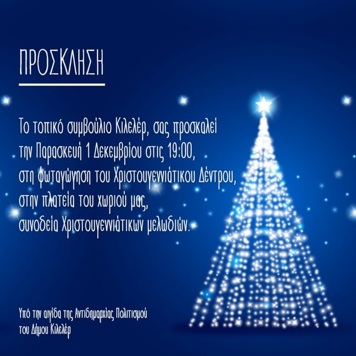 Την Παρασκευή 1 Δεκεμβρίου στις 19.00 στο Κιλελέρ, στην πλατεία του χωριού, το Τοπικό Συμβούλιο διοργανώνει τη φωταγώγηση του Χριστουγεννιάτικου δέντρου συνοδεία Χριστουγεννιάτικο μελωδιών.