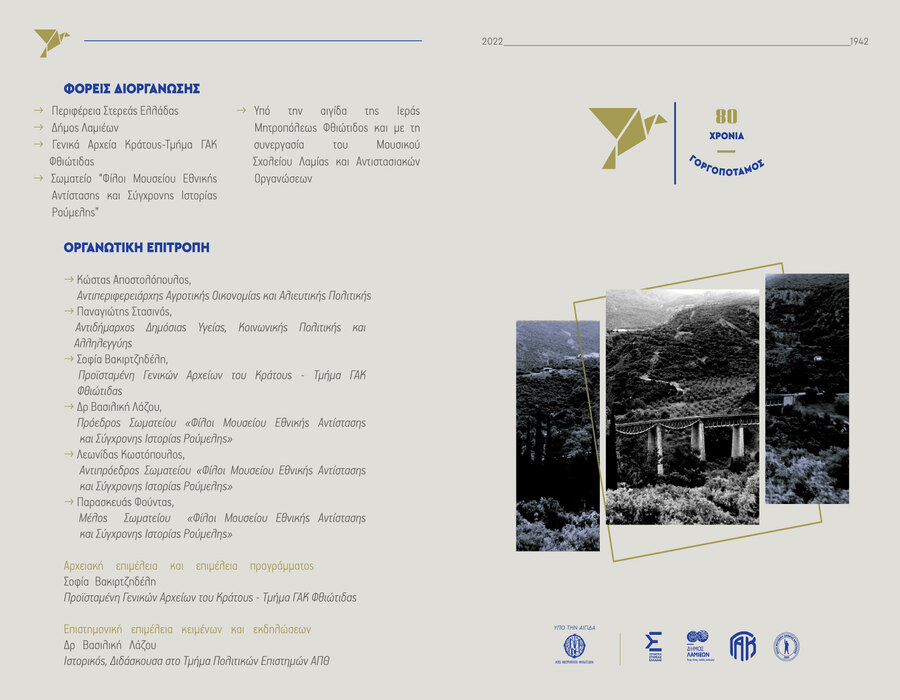o Έκθεση φωτογραφικού και αρχειακού υλικού με τίτλο: «Επιχείρηση Γοργοπόταμος. Το μεγαλύτερο σαμποτάζ της Αντίστασης». Εγκαίνια: 19 Νοεμβρίου 2022, ώρα 19.00. Τοποθεσία: Μουσείο Εθνικής Αντίστασης Δήμου Λαμιέων.