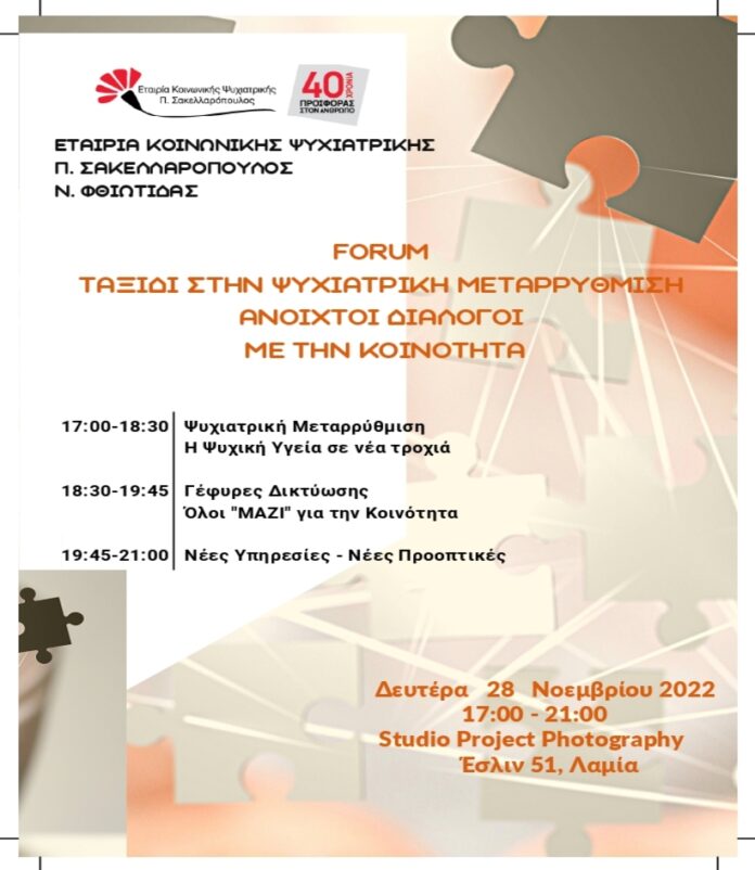 H Εταιρία Κοινωνικής Ψυχιατρικής Π. Σακελλαρόπουλος, με αφορμή τα 40 χρόνια λειτουργίας της, διοργανώνει επετειακό Forum τη Δευτέρα 28 Νοεμβρίου, κατά τις ώρες: 17.00 – 21.00 στο Studio Project Photography στην οδό Έσλιν 51 στη Λαμία.