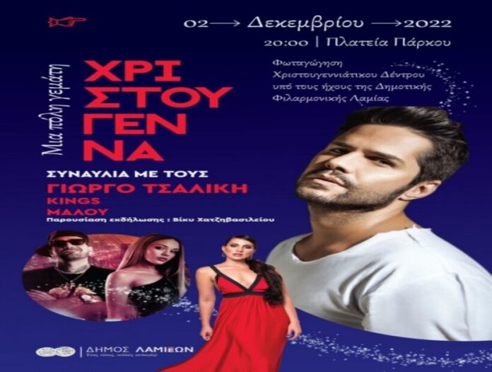 Το Κεντρικό Δέντρο της πόλης στην πλατεία Πάρκου θα φωταγωγηθεί υπό τους Ήχους της Δημοτικής Φιλαρμονικής Λαμίας στις 2 Δεκεμβρίου και ώρα 20.00, ενώ θα ακολουθήσει μεγάλη συναυλία με τον Γιώργο Τσαλίκη, τους Kings και την Μαλού με παρουσιάστρια της βραδιάς τη Βίκυ Χατζηβασιλείου.