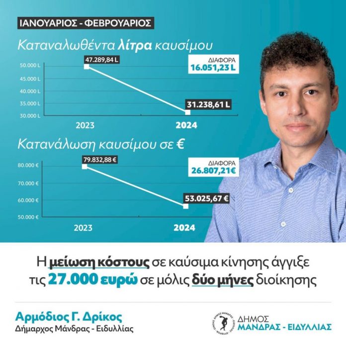 Ο Δήμαρχος Μάνδρας-Ειδυλλίας Αρμόδιος Δρίκος σε σχετική του τοποθέτησή τόνισε τα εξής: «Μία από τις πρώτες προτεραιότητες που προεκλογικά καταθέσαμε στους πολίτες ήταν το νοικοκύρεμα των οικονομικών του Δήμου μας. Με μεγαλύτερο στόλο οχημάτων στους δρόμους, πετύχαμε μόλις σε δύο μήνες, μικρότερη κατανάλωση καυσίμων και οικονομία χρημάτων. Η εξοικονόμηση πόρων είναι αποτέλεσμα σκληρής και επίμονης δουλειάς και σωστού προγραμματισμού. Η προσπάθεια φυσικά σε αυτό τον τομέα είναι άκρως απαιτητική και καθημερινή, και δεν πρέπει να σταματά ποτέ. Ένας Δήμος που εξοικονομεί χρήματα, σε στέρεες βάσεις, χωρίς «θηλιές» του παρελθόντος να τον στραγγαλίζουν οικονομικά, μπορεί να προσφέρει στους Δημότες και να στηρίξει τις ανάγκες του συνόλου. Δεν πανηγυρίζουμε, το νοικοκύρεμα συνεχίζεται».