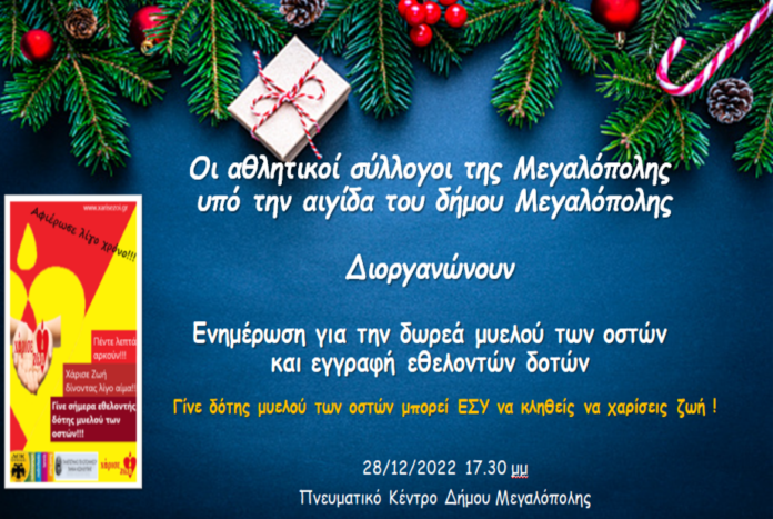 Την ΤΕΤΑΡΤΗ 28 Δεκεμβρίου2022 στις 17.30 οι αθλητικοί σύλλογοι της Μεγαλόπολης υπό την αιγίδα του Δήμου Μεγαλόπολης ενώνουν τις δυνάμεις τους για ένα μεγάλο σκοπό.
