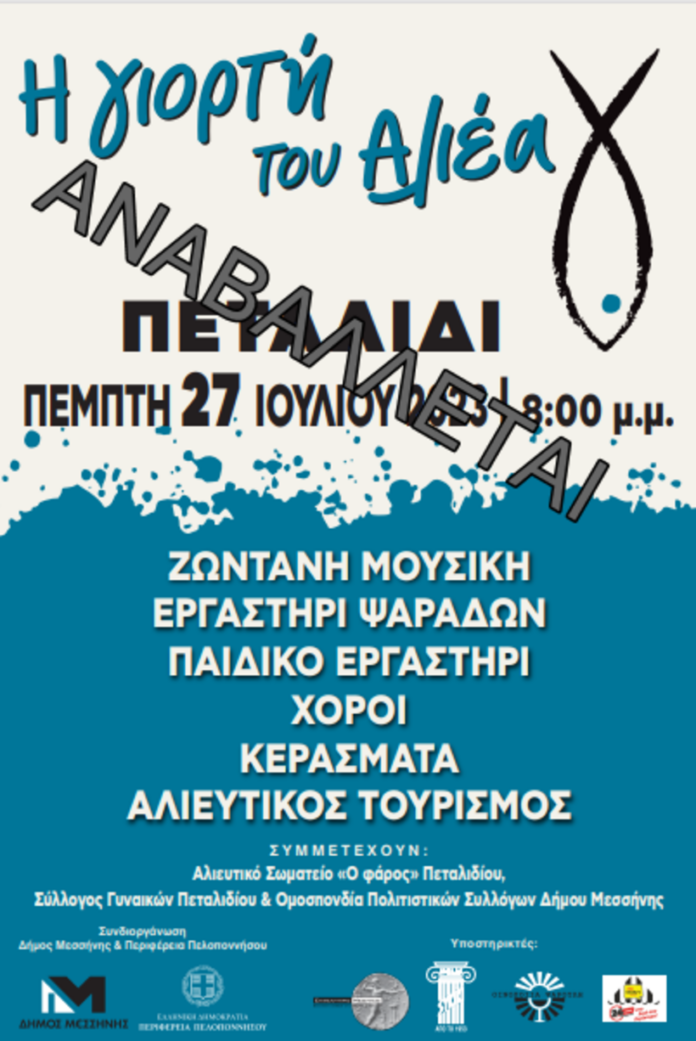 Λόγω του τριήμερου πένθους των Ενόπλων Δυνάμεων για τον θάνατο των δύο νεαρών πιλότων από την πτώση του Canadair στην Κάρυστο, αναβάλλεται η προγραμματισμένη για σήμερα «Γιορτή του αλιέα», που επρόκειτο να γίνει στις 8 μ.μ. στο Πεταλίδι.