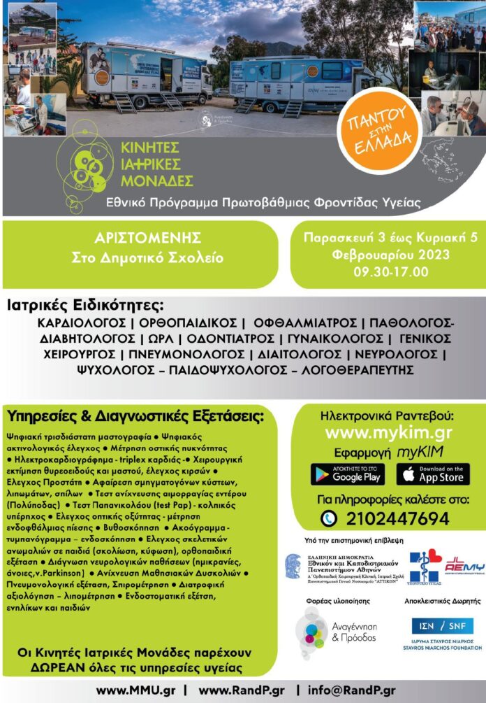 Στο πλαίσιο της υλοποίησης του Εθνικού Προγράμματος Πρωτοβάθμιας Φροντίδας Υγείας, Κινητές Ιατρικές Μονάδες, θα βρίσκονται στην Κοινότητα Αριστομένους από τις 3 έως τις 5 Φεβρουαρίου 2023, όπου θα υλοποιήσουν δωρεάν εξετάσεις στον χώρο του Δημοτικού Σχολείου.