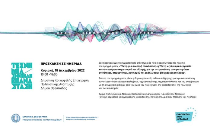 Το Τμήμα Πολιτισμού και Νεανικής Καλλιτεχνικής Δημιουργίας του Υπουργείου Παιδείας και Θρησκευμάτων σε συνεργασία με το Δήμο Ορεστιάδας προσκαλούν κάθε ενδιαφερόμενο στην Ημερίδα «Τέχνη, μια σιωπηλή επανάσταση: Η τέχνη ως δυναμικό εργαλείο κοινωνικού μετασχηματισμού και αλλαγής για την αντιμετώπιση των φαινομένων ανισότητας, στερεοτύπων, ρατσισμού και εκδηλώσεων βίας και κακοποίησης» που θα πραγματοποιηθεί την Κυριακή 18/12/2022 από τις 10:00 έως τις 16:00 στο Πολιτιστικό Πολύκεντρο του Δήμου Ορεστιάδας.