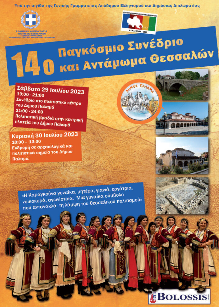Σε μια διαφορετική, σε σχέση με τις δεκατρείς προηγούμενες φορές, αλλά εξίσου όμορφη όσο και ιστορική γωνιά της πανέμορφης Θεσσαλίας, στο Δήμο Παλαμά, θα πραγματοποιηθεί φέτος, το «14ο Παγκόσμιο Συνέδριο και Αντάμωμα Θεσσαλών». Στην έδρα του δήμου, τον Παλαμά, με τα πλούσια ήθη και έθιμα της περιοχής, τα αξιόλογα μνημεία και την πολιτιστική παράδοση, το έντονο καραγκούνικο στοιχείο, την εύφορη γη, αλλά και την ανεπτυγμένη κτηνοτροφία, δίνουν το φετινό τους ραντεβού, οι Θεσσαλοί, ανά τον κόσμο!