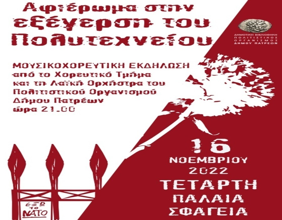 Ο Πολιτιστικός Οργανισμός του Δήμου Πατρέων με το Χορευτικό του Τμήμα τιμά στις 9.00 το βράδυ της Τετάρτης 16 Νοεμβρίου στα Παλαιά Σφαγεία την εξέγερση του Πολυτεχνείου, με ένα ξεχωριστό αφιέρωμα στα γεγονότα των ημερών.