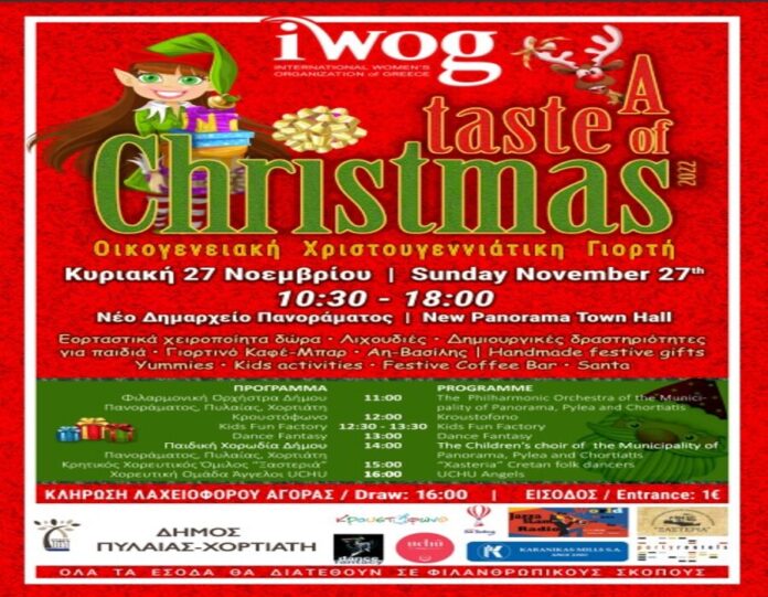 ΤΟ ΕΤΗΣΙΟ ΧΡΙΣΤΟΥΓΕΝΝΙΑΤΙΚΟ ΜΠΑΖΑΡ του, που συγκεντρώνει κάθε φορά εκατοντάδες επισκέπτες από όλη τη Θεσσαλονίκη διοργανώνει φέτος στο Πανόραμα ο Διεθνής Σύλλογος Γυναικών Ελλάδας (International Womens Organization of Greece) σε συνεργασία με τον δήμο Πυλαίας Χορτιάτη.