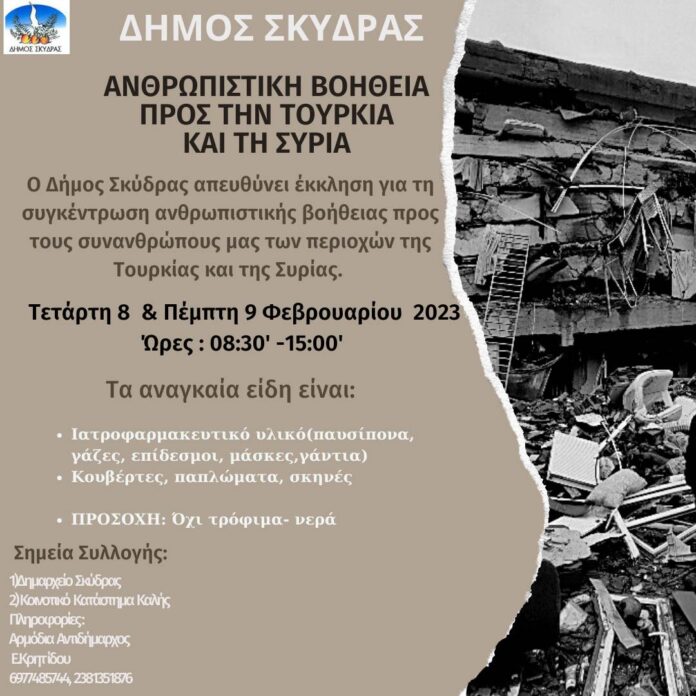 Ο Δήμος Σκύδρας συμμετέχει στην πανελλαδική και διεθνή κινητοποίηση για την παροχή άμεσης και ουσιαστικής ανθρωπιστικής βοήθειας στις σκληρά δοκιμαζόμενες σεισμόπληκτες περιοχές της Τουρκίας και της Συρίας.