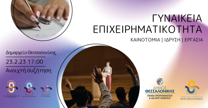 Ανοιχτή συζήτηση με θέμα «Γυναικεία Επιχειρηματικότητα» διοργανώνει το Δημοτικό Συμβούλιο Νέων Θεσσαλονίκης σε συνεργασία με το τμήμα Προγραμμάτων και Δια Βίου Μάθησης της Αντιδημαρχίας Παιδείας του Δήμου Θεσσαλονίκης την Πέμπτη 23 Φεβρουαρίου στις 17:00, στην αίθουσα Μανόλης Αναγνωστάκης του Δημαρχιακού Μεγάρου Θεσσαλονίκης.