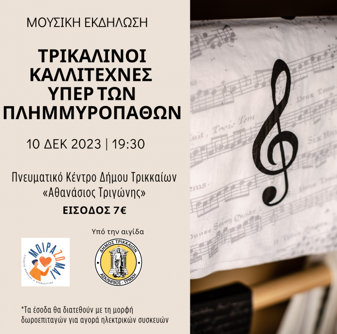 Ο σύλλογος ΜοιράΖΩμαι υπό την αιγίδα του Δήμου Τρικκαίων διοργανώνει μια μεγάλη συναυλία τη Κυριακή 10 Δεκεμβρίου 2023 στις 19.30 στο Πνευματικό Κέντρο Δήμου Τρικκαίων «Αθανάσιος Τριγώνης» με τη συμμετοχή πολλών τρικαλινών καλλιτεχνών. Οι καλλιτέχνες πλαισιώνονται από τρικαλινούς οργανοπαίκτες με σολίστ μπουζουκιού τον Βασίλη Μητσάκη και ενορχήστρωση τον Τάκη Καρανικόλα. Θα τραγουδήσουν οι τρικαλινοί/ες καλλιτέχνες (με αλφαβητική σειρά) οι: