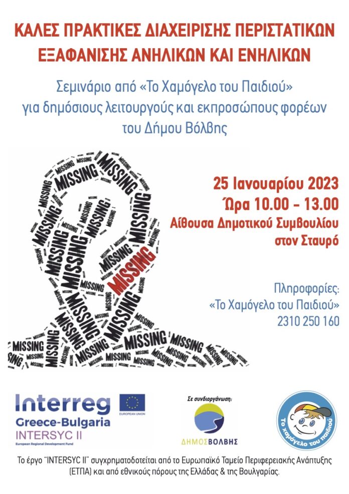 Η οργάνωση «Το Χαμόγελο του Παιδιού» και ο Δήμος Βόλβης την Τετάρτη 25 Ιανουαρίου 2023, 10.00 π.μ. – 13:00 μ.μ. στην αίθουσα του Δημοτικού Συμβουλίου στον Σταυρό συνδιοργανώνουν σεμινάριο για τις «Καλές πρακτικές διαχείρισης περιστατικών εξαφάνισης ανηλίκων και ενηλίκων», τη λειτουργία της Ευρωπαϊκής Γραμμής για τα Εξαφανισμένα Παιδιά 116000 και της Εθνικής Γραμμής για τους Αγνοούμενους Ενήλικες 1017, τις οποίες λειτουργεί «Το Χαμόγελο του Παιδιού» 24/7, 365 ημέρες με εξειδικευμένους ψυχολόγους.