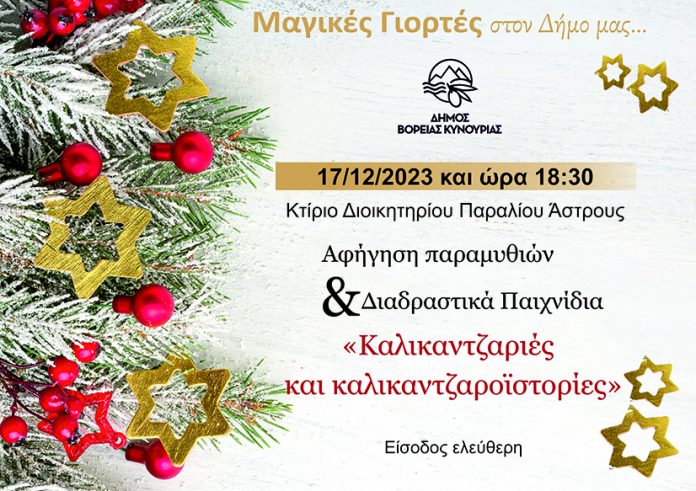 Στο πλαίσιο των Χριστουγεννιάτικων εκδηλώσεων 2023 του Δήμου Βόρειας Κυνουρίας την Κυριακή 17 Δεκεμβρίου και ώρα 18:30, στο Κτίριο του Διοικητηρίου Παραλίου Άστρους θα πραγματοποιηθεί αφήγηση παραμυθιών με θέμα τον ερχομό των Καλικάντζαρων στη Γη και πρωταγωνιστή τον Πρασινοσκούφη.