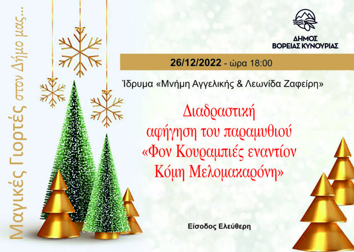 Στο πλαίσιο των Χριστουγεννιάτικων εκδηλώσεων 2022 του Δήμου Βόρειας Κυνουρίας τη Δευτέρα 26 Δεκεμβρίου και ώρα 18:00, στο Ίδρυμα “Μνήμης Αγγελικής & Λεωνίδα Ζαφείρη”, θα προβληθεί η Διαδραστική αφήγηση του παραμυθιού “Φον Κουραμπιές εναντίον Κόμη Μελομακαρόνη”, του Κυριάκου Χαρίτου.
