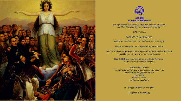 Με την αρμόζουσα επισημότητα γιορτάζει ο Δήμος Βόρειας Κυνουρίας την Εθνική Επέτειο της 25ης Μαρτίου 1821. Αποτελεί έναν από τους σημαντικότερους αγώνες του Ελληνικού Έθνους σε όλη την ιστορική διαδρομή του. Είναι ημέρα μνήμης, τιμής και ευγνωμοσύνης στους ηρωικούς αγωνιστές, στην ηρωική γενιά του 1821, η οποία οδήγησε στην Ελευθερία του σκλαβωμένου Ελληνισμού.