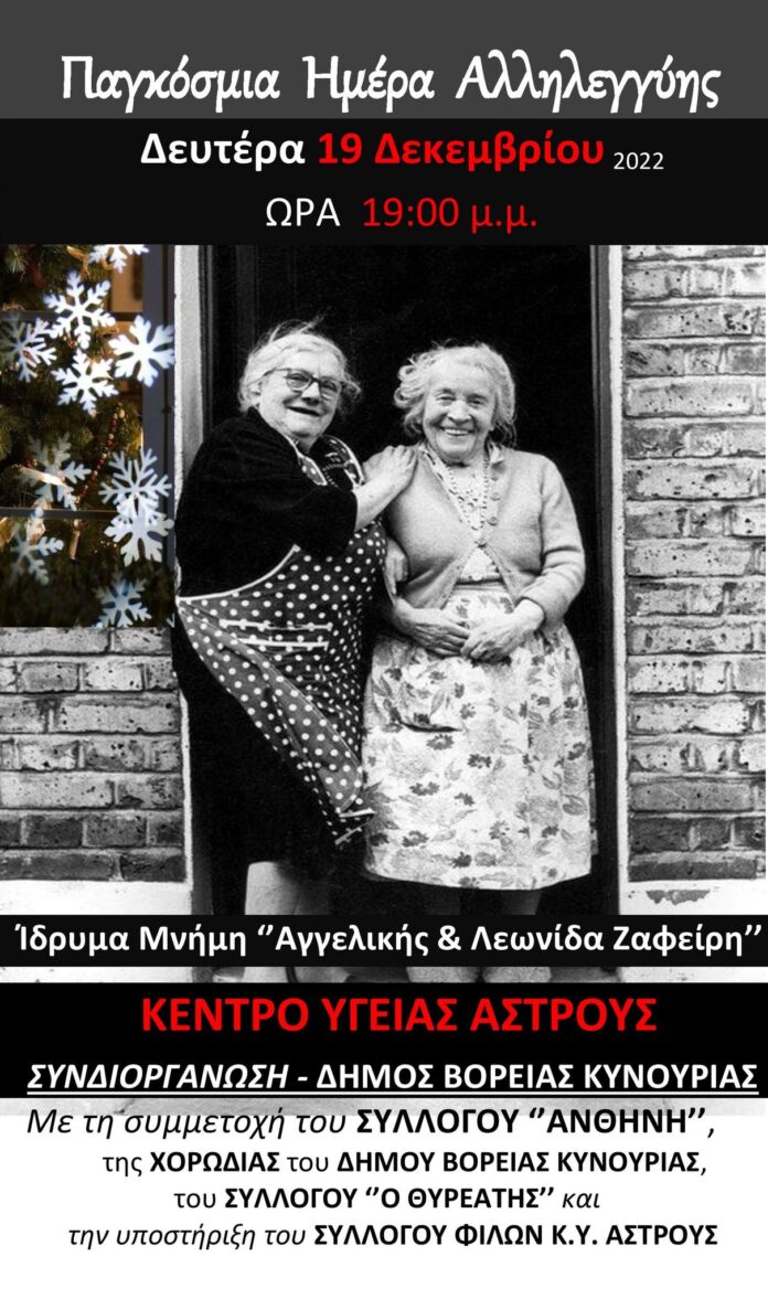Τη Δευτέρα 19 Δεκεμβρίου 2022 και ώρα 19:00, στο Ίδρυμα “Μνήμη Αγγελικής & Λεωνίδα Ζαφείρη” στο Άστρος, θα πραγματοποιηθεί εορταστική εκδήλωση για την “Παγκόσμια Ημέρα Αλληλεγγύης”.