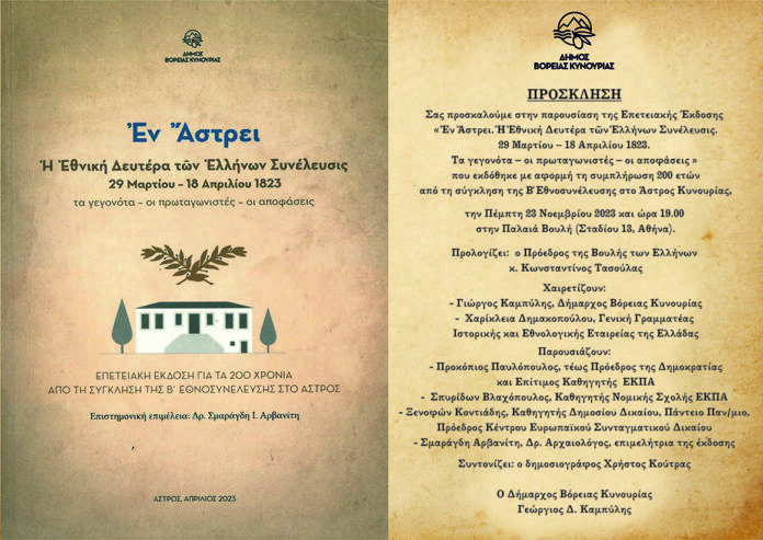 Ο Δήμος Βόρειας Κυνουρίας σας προσκαλεί στην παρουσίαση της Επετειακής Έκδοσης «Ἐν Ἄστρει: Ἡ Ἐθνική Δευτέρα τῶν Ἑλλήνων Συνέλευσις. 29 Μαρτίου – 18 Απριλίου 1823. Τα γεγονότα – οι πρωταγωνιστές – οι αποφάσεις» που εκδόθηκε με αφορμή τη συμπλήρωση 200 ετών από τη σύγκληση της Β΄ Εθνοσυνέλευσης στο Άστρος Κυνουρίας.