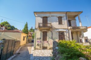 – Αποκατάσταση του εναπομείναντος χώρου της οδού με κυβόλιθο από πλάκα τύπου Δεματίου και τοποθέτηση αγκωναριών από μάρμαρο Αλιβερίου