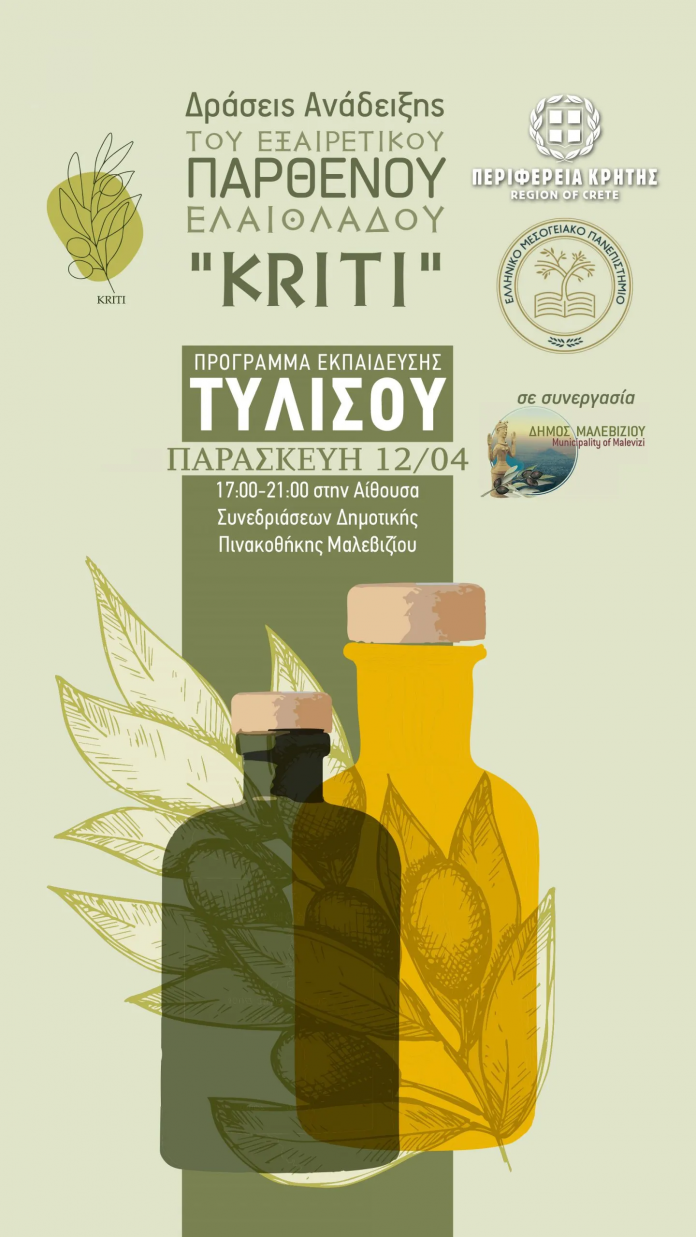 Η Περιφέρεια Κρήτης και το Ελληνικό Μεσογειακό Πανεπιστήμιο, σε συνεργασία με το Δήμο Μαλεβιζίου, διοργανώνουν εκπαίδευση για την ποιότητα του Εξαιρετικού Παρθένου Ελαιόλαδου “Kriti” η οποία θα πραγματοποιηθεί την Παρασκευή, 12 Απριλίου 2024 στις 17:00, στην Αίθουσα Συνεδριάσεων Δημοτικής Πινακοθήκης Μαλεβιζίου, στην Τύλισο.