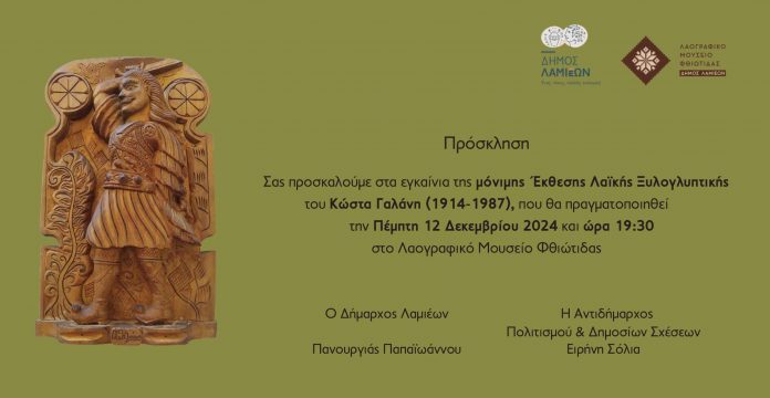Ο Δήμος Λαμιέων σας προσκαλεί την Πέμπτη 12 Δεκεμβρίου 2024 και ώρα 19:30 στα εγκαίνια της μόνιμης έκθεσης Λαϊκής Ξυλογλυπτικής του Κώστα Γαλάνη (1914-1987), στο Λαογραφικό Μουσείο Φθιώτιδας, στην Οδό Καλύβα Μπακογιάννη 6.