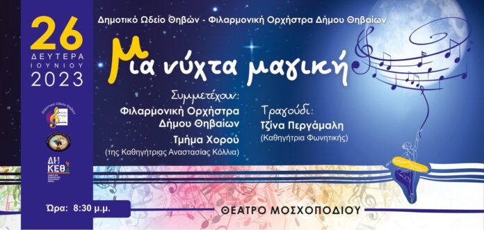 Η Δημοτική Κοινωφελής Επιχείρηση Δήμου Θηβαίων, σας προσκαλεί στην καλοκαιρινή εκδήλωση του Δημοτικού Ωδείου Θήβας, για μία Νύχτα Μαγική, με μουσική μεγάλων συνθετών μας, τη Δευτέρα 26 Ιουνίου 2023 ώρα 8.30 μ.μ., στο Θέατρο Μοσχοποδίου (Μελίνα Μερκούρη)