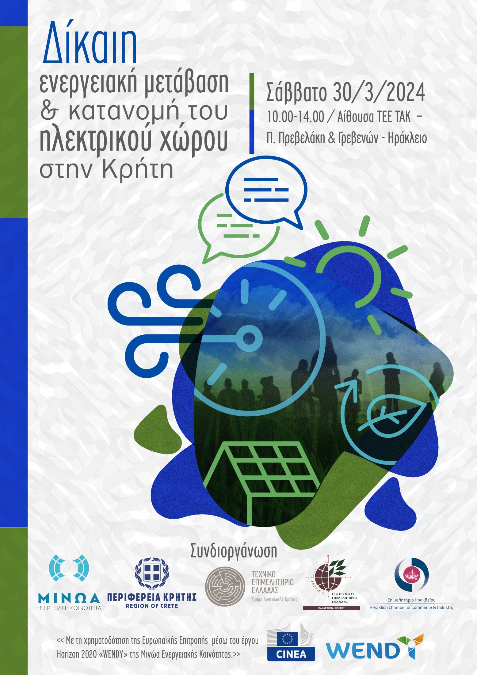 Με κοινή πρωτοβουλία της Μινώα Ενεργειακής Κοινότητας Πολιτών, της Περιφέρειας Κρήτης, και των Επιμελητηρίων ΤΕΕ, ΓΕΩΤΕΕ, ΕΒΕΗ, διοργανώνεται διευρυμένη εκδήλωση με κεντρικό θέμα τη «Δίκαιη ενεργειακή μετάβαση και την κατανομή του ηλεκτρικού χώρου στην Κρήτη». Η εκδήλωση, η οποία απευθύνεται σε όλους τους πολίτες, φορείς, επιχειρήσεις, αιρετή και δημόσια διοίκηση, θα πραγματοποιηθεί  στην αίθουσα του Τεχνικού Επιμελητηρίου / ΤΕΕ-ΤΑΚ  (Π. Πρεβελάκη και Γρεβενών) ημέρα Σάββατο 30 Μαρτίου 2024 και ώρα 10π.μ.