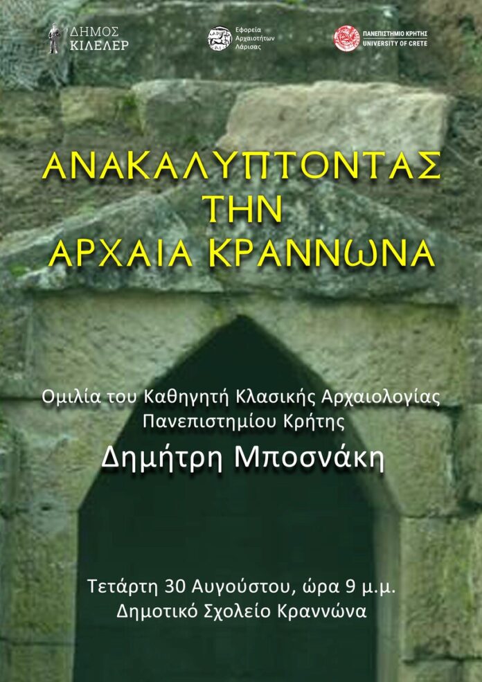 Ο Δήμος Κιλελέρ και η Εφορεία Αρχαιοτήτων Λάρισας διοργανώνουν εκδήλωση την Τετάρτη 30/8 και ώρα 9.00μ.μ., στον αύλειο χώρο του Δημοτικού Σχολείου Κραννώνα, με ομιλία του Καθηγητή Κλασικής Αρχαιολογίας του Πανεπιστημίου Κρήτης κ. Δημήτρη Μποσνάκη με θέμα «Ανακαλύπτοντας την αρχαία Κραννώνα».