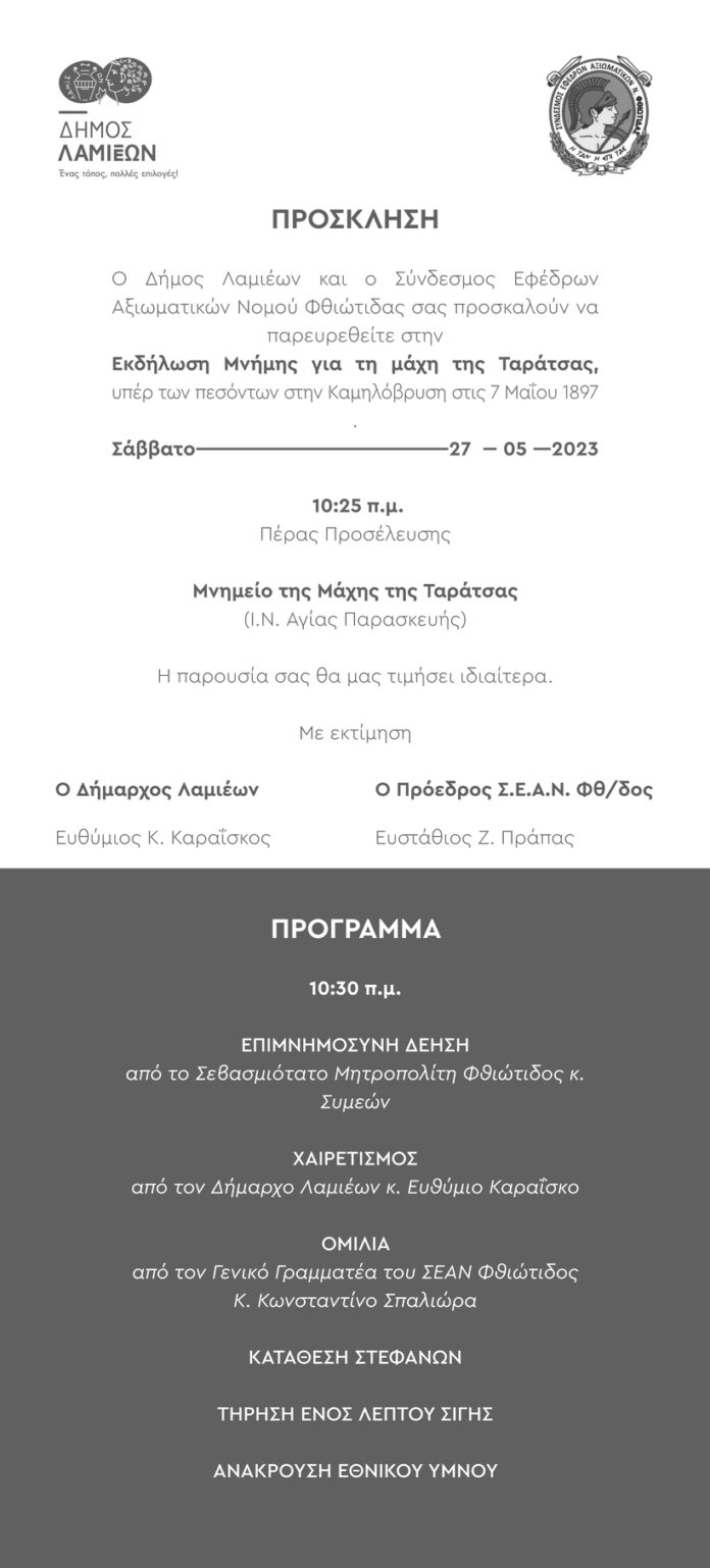 Ο Δήμος Λαμιέων και ο Σύνδεσμος Εφέδρων Αξιωματικών Νομού Φθιώτιδας, πραγματοποιούν Εκδήλωση Μνήμης για τη μάχη της Ταράτσας, υπέρ των πεσόντων στην Καμηλόβρυση στις 7 Μαΐου 1897, το Σάββατο 27 Μαΐου 2023 και ώρα 10:30 π.μ., στο Μνημείο της Μάχης της Ταράτσας (Ι.Ν. Αγίας Παρασκευής).