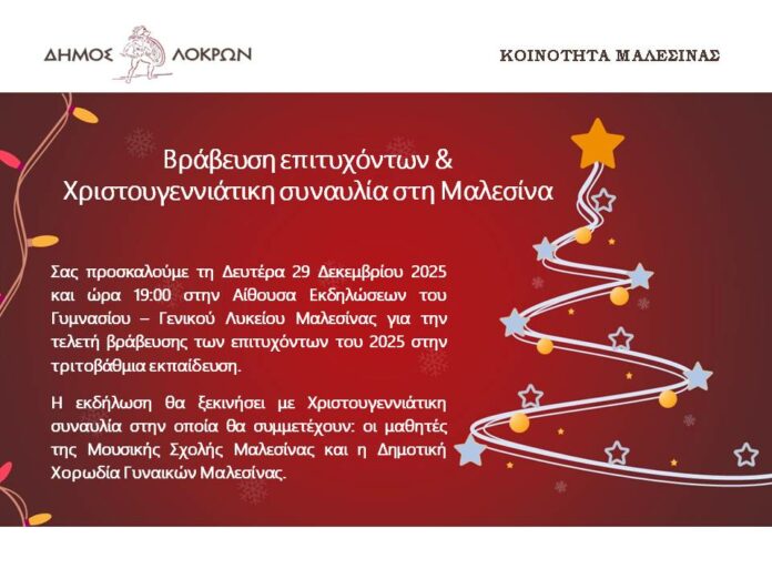 Εκδήλωση βράβευσης επιτυχόντων 2024-2025 Μαλεσίνας και Χριστουγεννιάτικη Συναυλία των μαθητών της Μουσικής Σχολής και της Δημοτικής Χορωδίας Γυναικών Μαλεσίνας.