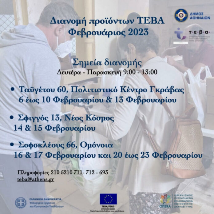 Ο Δήμος Αθηναίων και η Διεύθυνση Κοινωνικής Αλληλεγγύης συνεχίζουν να στηρίζουν τους συμπολίτες μας που βρίσκονται σε ανάγκη προγραμματίζοντας για τον μήνα Φεβρουάριο στο πλαίσιο του “Επιχειρησιακού Προγράμματος Επισιτιστικής Βοήθειας” ΤΕΒΑ, μια ακόμη διανομή τροφίμων και προϊόντων υγιεινής σε 23.213 δικαιούχους του.